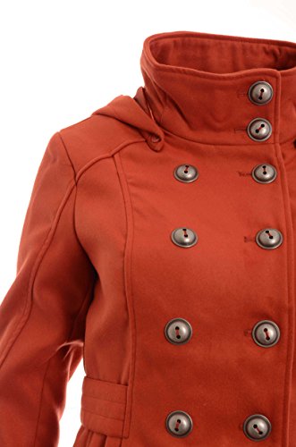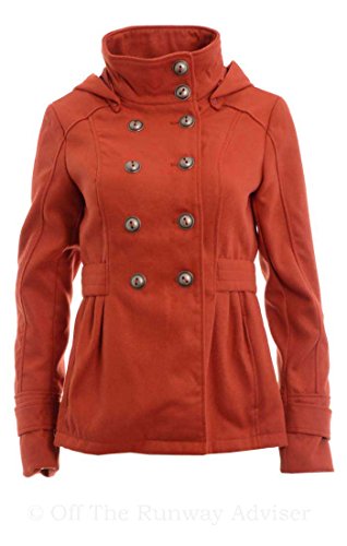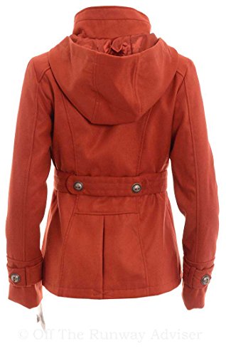 This coat by Celebrity Pink features stand collar, removable hood, double breasted button front closure, long sleeves, tabs at waist, on-seam pockets, pleated back hem, full lining, lightweight.