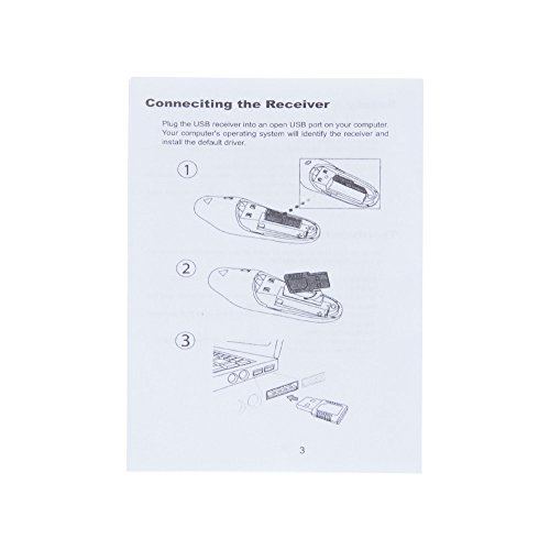 Environmentally friendly ABS plastics; A plug-and-play wireless receiver; Wireless Technology: 2.4 GHz; Battery Not Included; Wireless remote control distance range of up to 39 feet (12 meters), so you can free to move around the room and interact with your audience; Buttons: laser pointer, display of black screen, next, previous, full screen, on/off switch; One-touch keys easy to control slideshow; A red laser pointer that's easy to see against most backgrounds, highlight key areas of your slides; Size:10.5*4*2.7cm