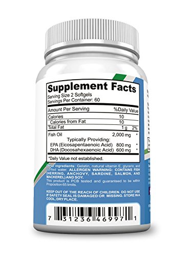 ★DR. RECOMMENDED DOSAGE - Just two serving a day of our molecularly distilled Omega 3 pills deliver the highest recommended amount of (4000mg,1200,1800) DHA and EPA. Consult a vet before using fish oil capsules on dogs or cats.